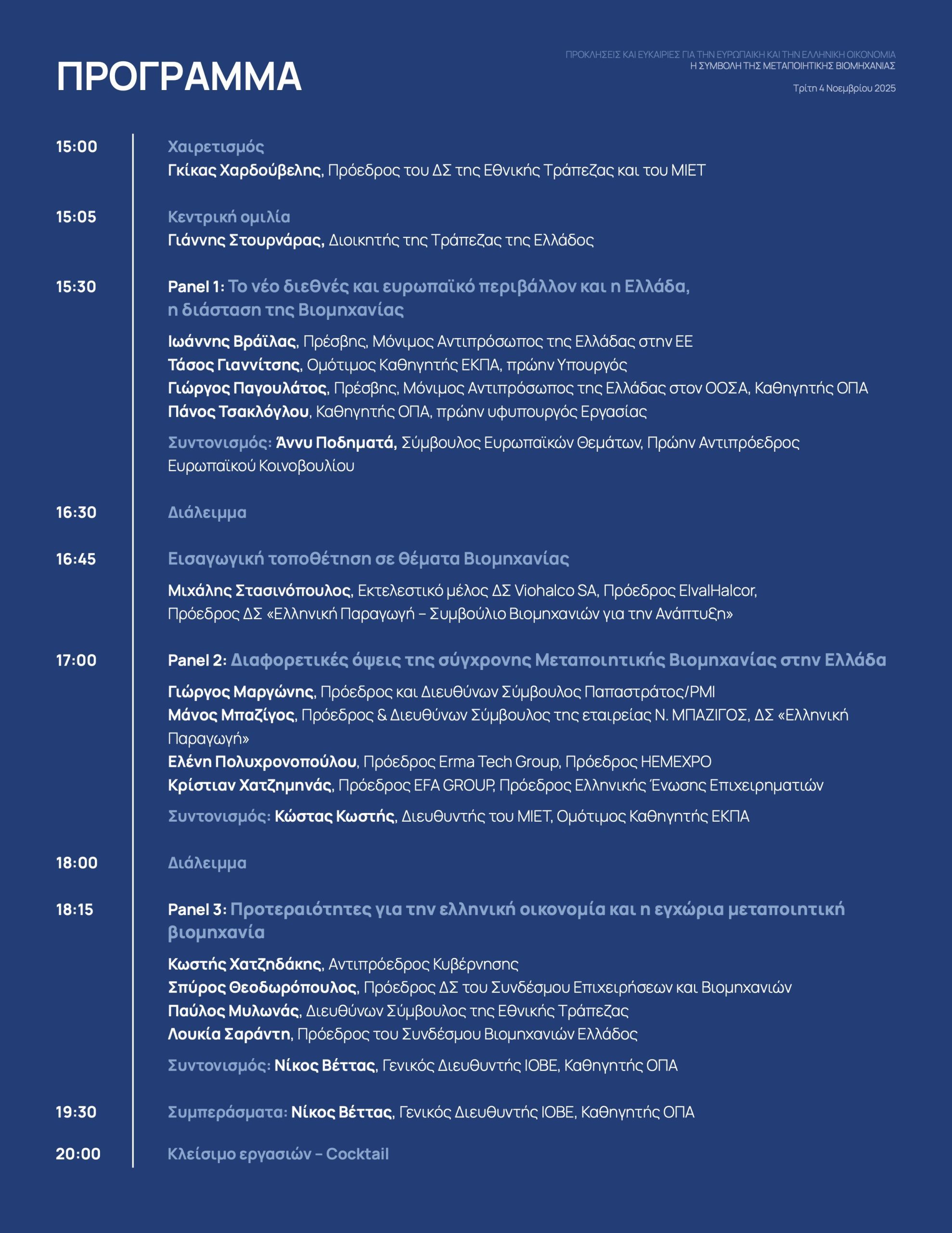 Κορυφαίοι πολιτικοί, ακαδημαϊκοί και εκπρόσωποι του επιχειρηματικού κόσμου ανέπτυξαν τις απόψεις τους για το μέλλον της Ευρωπαϊκής και της Ελληνικής Οικονομίας καθώς και για το ρόλο της Μεταποιητικής Βιομηχανίας στην προσπάθεια ανάπτυξης και ενίσχυσης της ανταγωνιστικότητας και της κοινωνικής συνοχής.